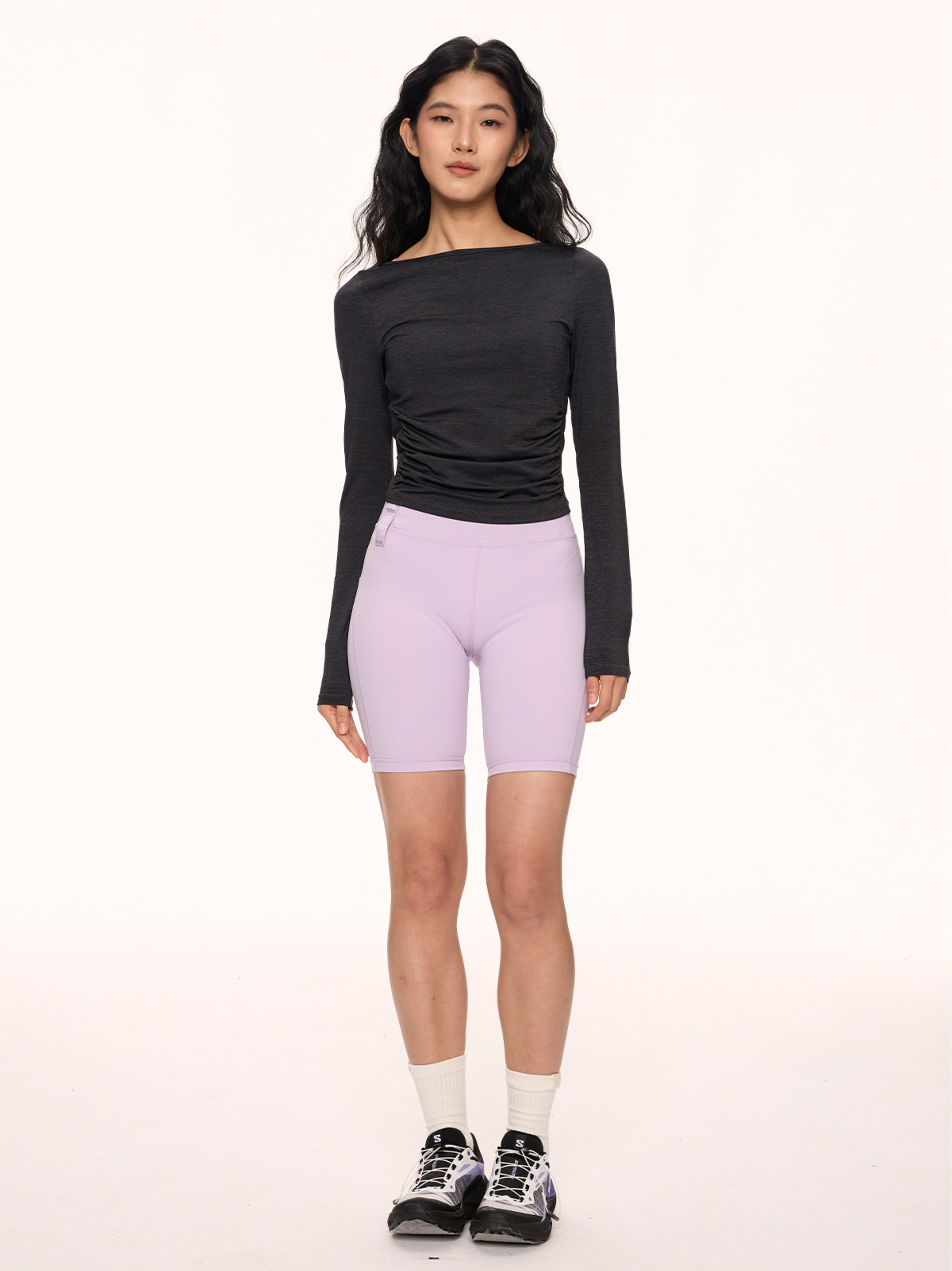 #OffShoulderSportsTop #SlimFitYogaTee #LongSleeveAthleticShirt #FluoriteSheenFabric #WorkoutToStreetStyle #AthleisureFashion